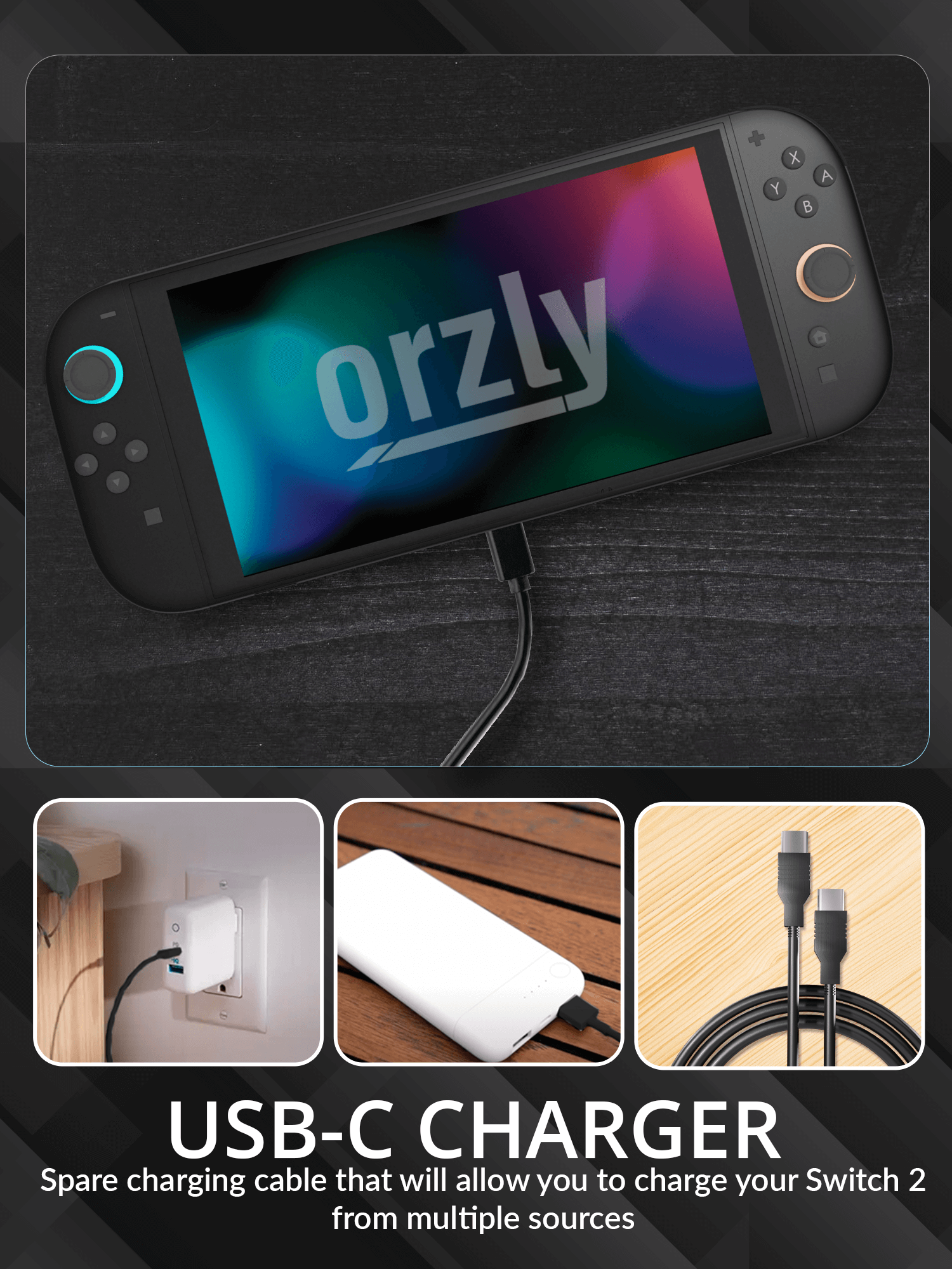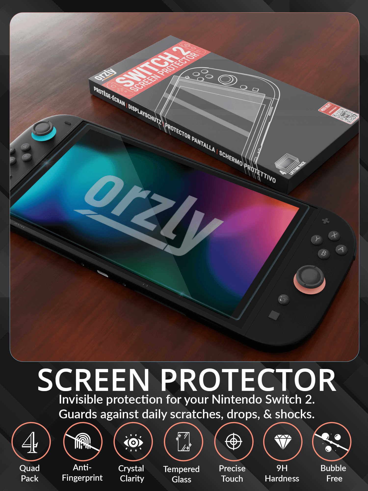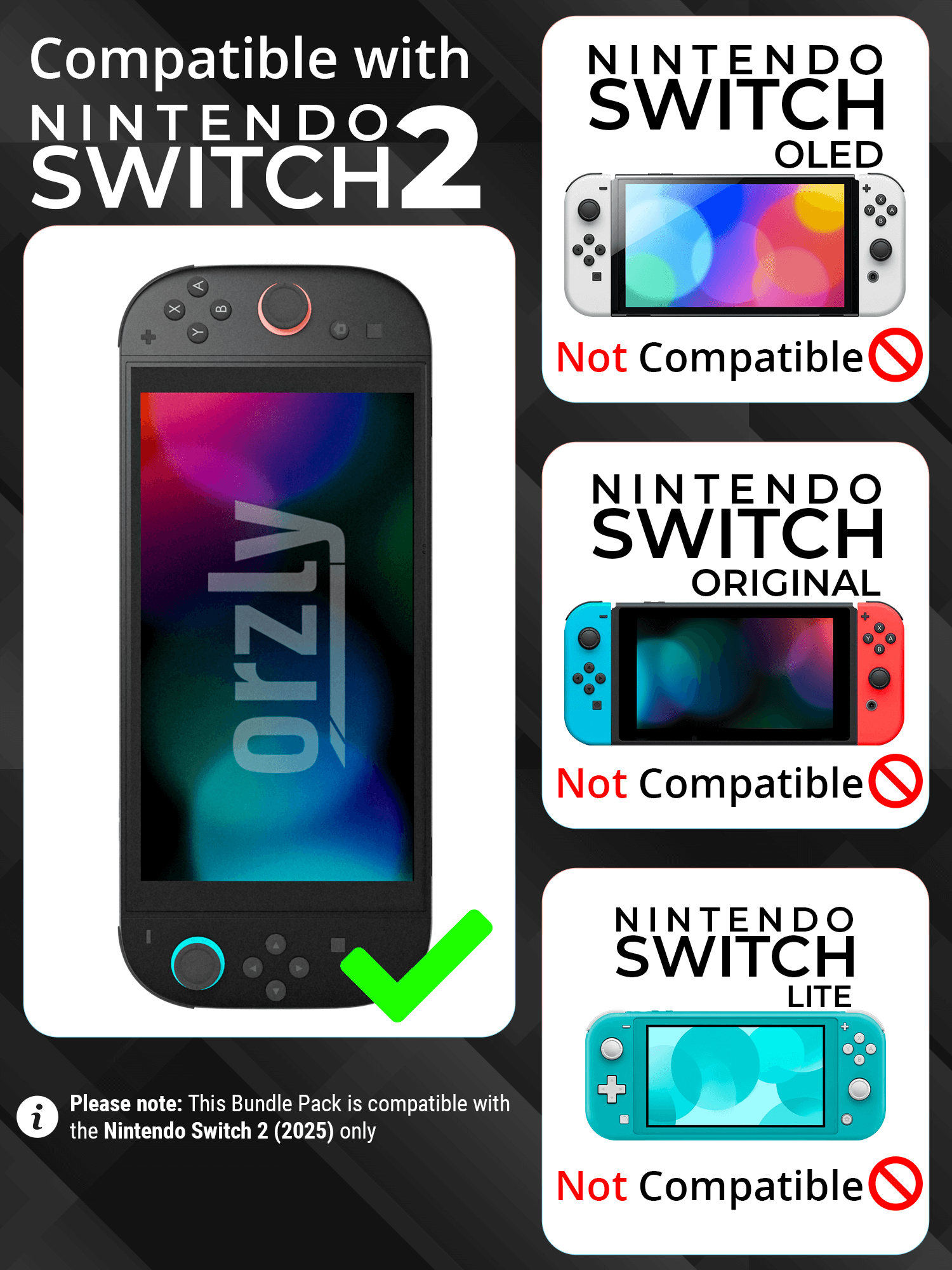Everything you need to protect, play, and power your Nintendo Switch 2 — all in one bundle. The Orzly Accessory Pack includes essential gear designed to keep your console safe, enhance your comfort, and make gaming on the go effortless. Protective Carry Case Keep your Nintendo Switch 2 safe wherever you go. The Orzly Carry Case features a hard outer shell for impact protection and a soft interior lining to prevent scratches. It includes a dedicated section for your console, plus room for accessories and up to 12 game cards. Tempered Glass Screen Protectors Shield your screen from scratches, smudges,...